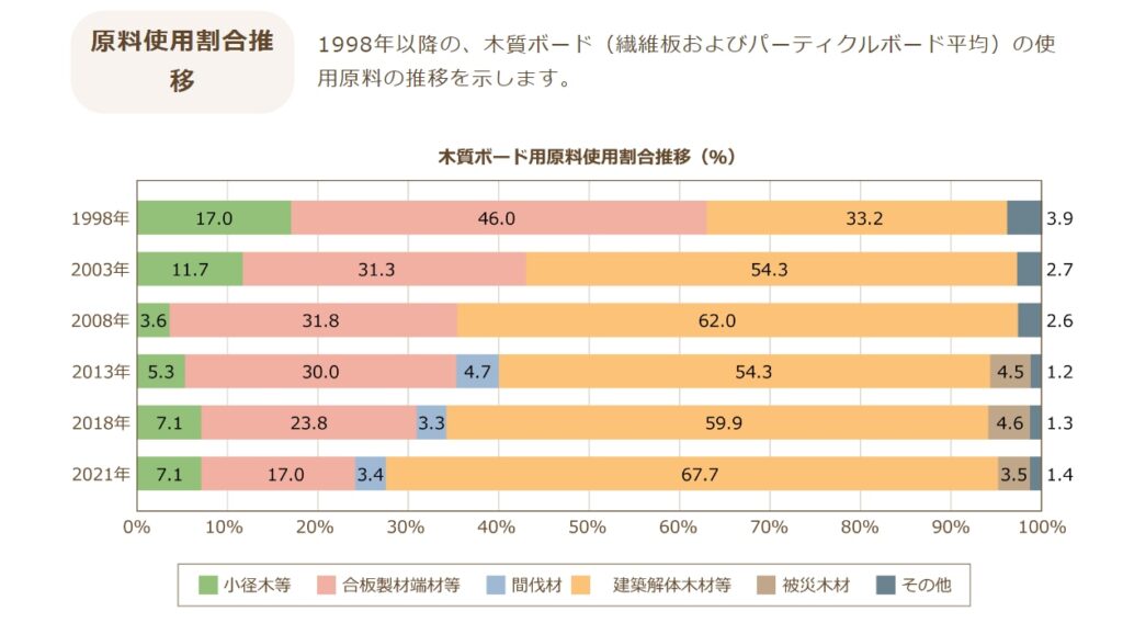 というのも、パーティクルボードの材料は、細かくした木片を接着剤で固めているのはもちろんのこと、国内だけで9割、海外含むと7割が建築廃材や被災廃材でできています。